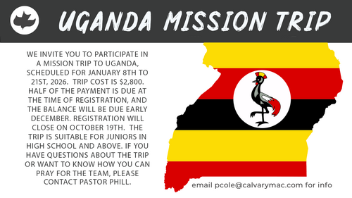 Please pray for our mission trip to Uganda, scheduled for January 8th to 21st, 2026.